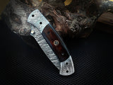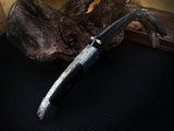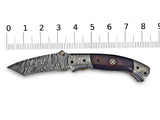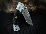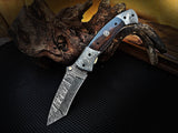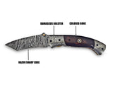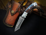 Discover our Folding Pocket Tanto Knife, featuring a stunning colored camel bone handle and double Damascus bolster. At 8.5 inches, this handcrafted Damascus steel knife is perfect for outdoor adventures or as a unique gift. Comes with a leather sheath for convenient carrying.