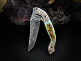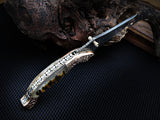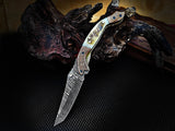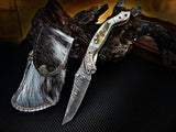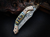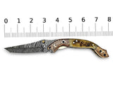Experience the exceptional quality of the 8-inch Damascus Steel Folding Tanto Knife by ColdLand Knives. This custom handcrafted knife features a unique Bighorn Sheep horn handle and engraved double copper bolster, paired with a durable leather sheath for convenient carry. Perfect for camping, hunting, and collecting, this piece makes a remarkable gift for any occasion.