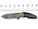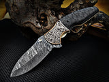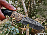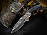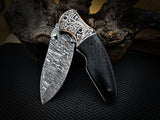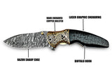 Discover the Alien Graphic Laser Engraving on Buffalo Horn Folding Pocket Knife, featuring a striking drop point blade crafted from custom Damascus steel. With a hand-engraved copper bolster and an 8-inch length, this unique knife is perfect for space lovers and outdoor enthusiasts alike. It comes with a leather sheath for secure storage and easy portability.
