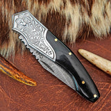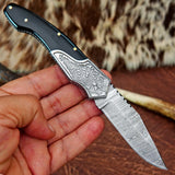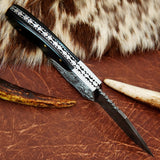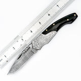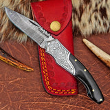 Pocket Folding Knife EDC Hand Forged in Damascus Steel Engraved Bolster and Buffalo Horn Handle with Leather Sheath SQFOL01-V3