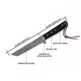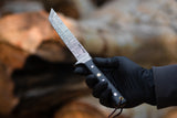 Blade: 5.75" Damascus steel blade, forged with 156 true layers (4340 & 1060), with a Sabre Grind edge for clean cuts and durability