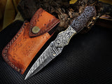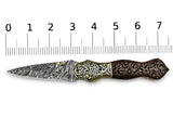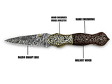 Présentation du couteau de poche pliant en bois de noyer et de mitre en laiton gravé à la main, un superbe poignard de 7,5 pouces fabriqué en acier de Damas personnalisé. Idéal pour les amateurs d'art et les collectionneurs, ce couteau allie un design exquis à la fonctionnalité, avec un étui en cuir durable pour un rangement sécurisé et un transport facile.