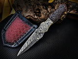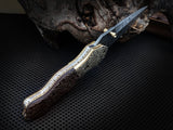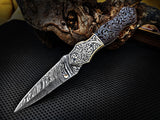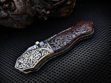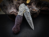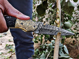 Couteau de poche pliant en laiton gravé à la main et poignard en bois de ronce de noyer en acier de Damas fabriqué à la main sur mesure de 7,5 pouces avec étui en cuir Cadeau parfait pour les amateurs d'art et les collectionneurs CLKFOL1122