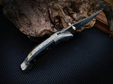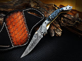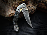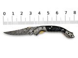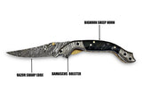 Découvrez l'art de notre couteau de poche pliable Tanto, doté d'un superbe manche en corne de mouflon d'Amérique et d'un double traversin en Damas. Mesurant 20,3 cm, ce couteau en acier Damas fabriqué à la main est parfait pour les aventures en plein air ou comme cadeau unique. Livré avec un étui en cuir pour un transport facile.